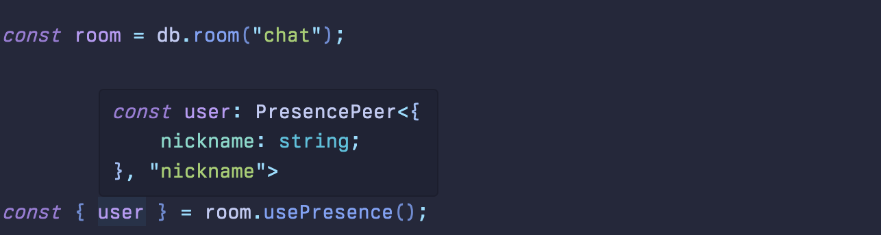 const room = db.room('chat', 'hacker-chat-room-id'); // We only return the `status` value for each peer // We will _only_ trigger an update when a user's `status` value changes const { user, peers, publishPresence } = db.rooms.usePresence(room, { keys: ['status'], });